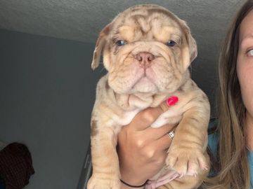 One of our females: I just wanted to show you that without a DNA merle test you might not think she would carry the merle gene. She is what they call a Cryptic Merle. Very important in the breeding world that you NEVER mate two merle bulldogs together.