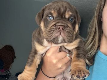 This is a Beanies Bullies production: This little chocolate boy has Tri points Amazing blue eyes. The most important part of getting the chocolate color is you have a {DD or Dd} but always have the {bb} gene.