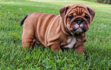 Gizmo (the dad) is a Red Sable fully suited English Bulldog. Only 13 inches high and he makes wrinkles look sexy. He is health tested and clear of all HU, DM, CRM1 and CY.